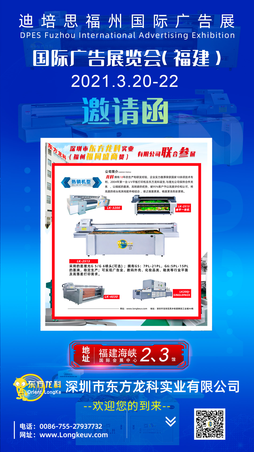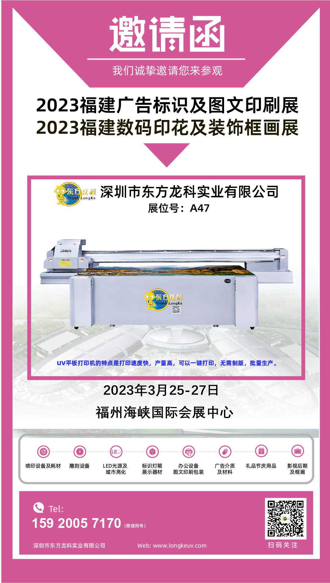東方龍科uv打印機(jī)2023福建廣告標(biāo)識及圖文印刷展《邀請函》 福建省福州展會25-27日,海峽國際會展中心展會號:A47等候各位老板蒞臨參觀!