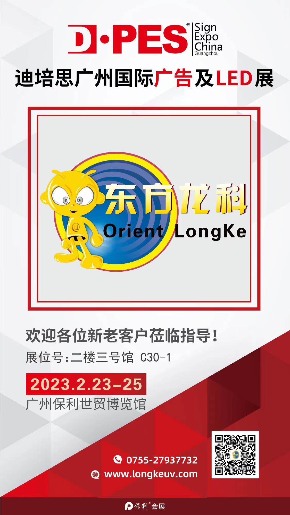 東方龍科uv打印機(jī)2023年迪培思廣州國際廣告展邀請函 展覽日期 2023年2月23-2月25日(星期四至星期六) 展館:廣州琶洲保利世貿(mào)博覽館 地址:廣州市海珠區(qū)新港東路100號