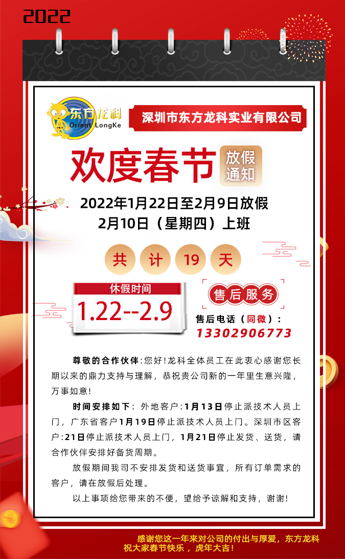 尊敬的客戶: 您好! 春節(jié)即將來臨,深圳東方龍科全體員工在此提前恭祝大家新春快樂!為了讓大家能夠更好地安排節(jié)日期間的相關(guān)事宜,現(xiàn)將我司 2025 年春節(jié)放假安排通知如下: 一、