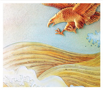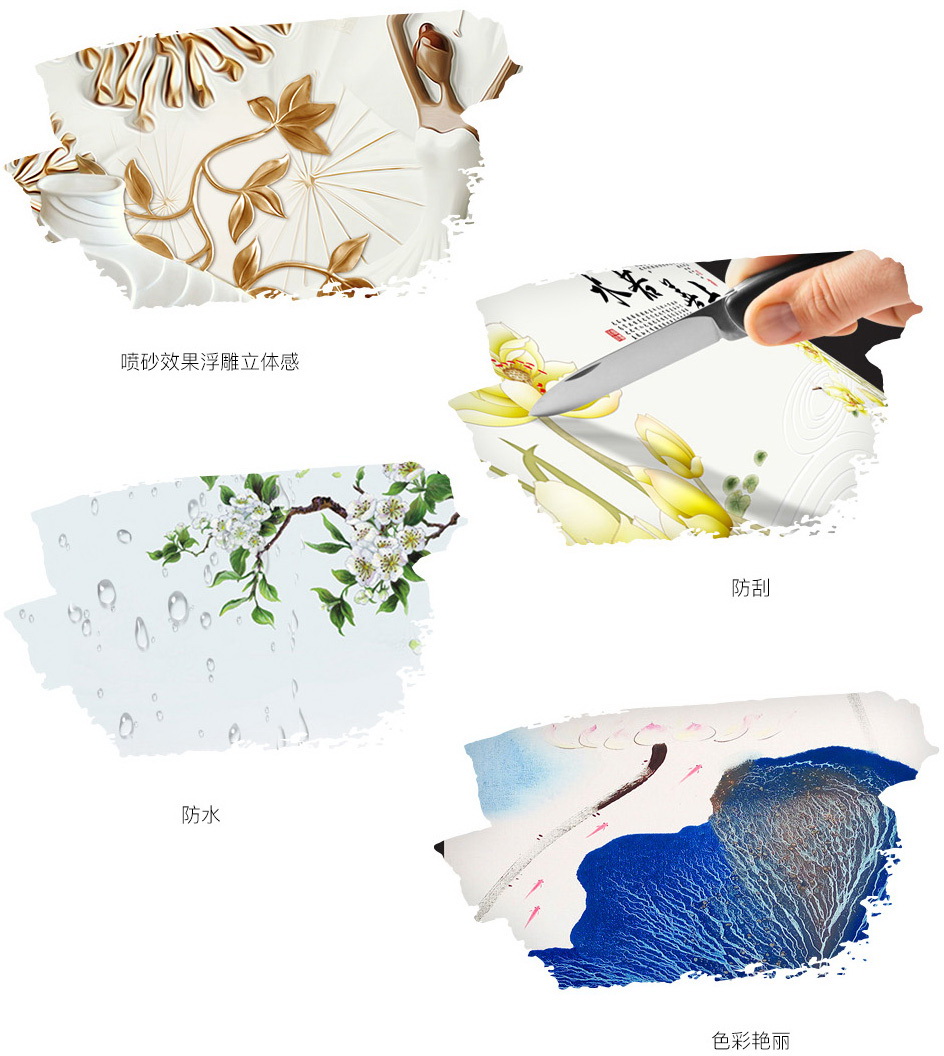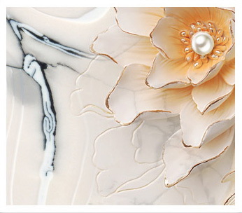 彩雕背景墻是在瓷磚上先用雕刻機(jī)和噴砂機(jī)按路徑打磨出立體效果,然后再打彩上油。市場(chǎng)上大部分浮雕(陰雕或陽雕)效果的瓷磚背景墻都是這種工藝。